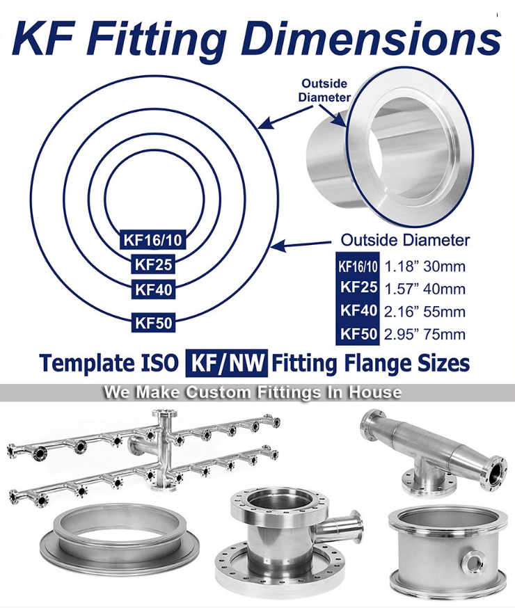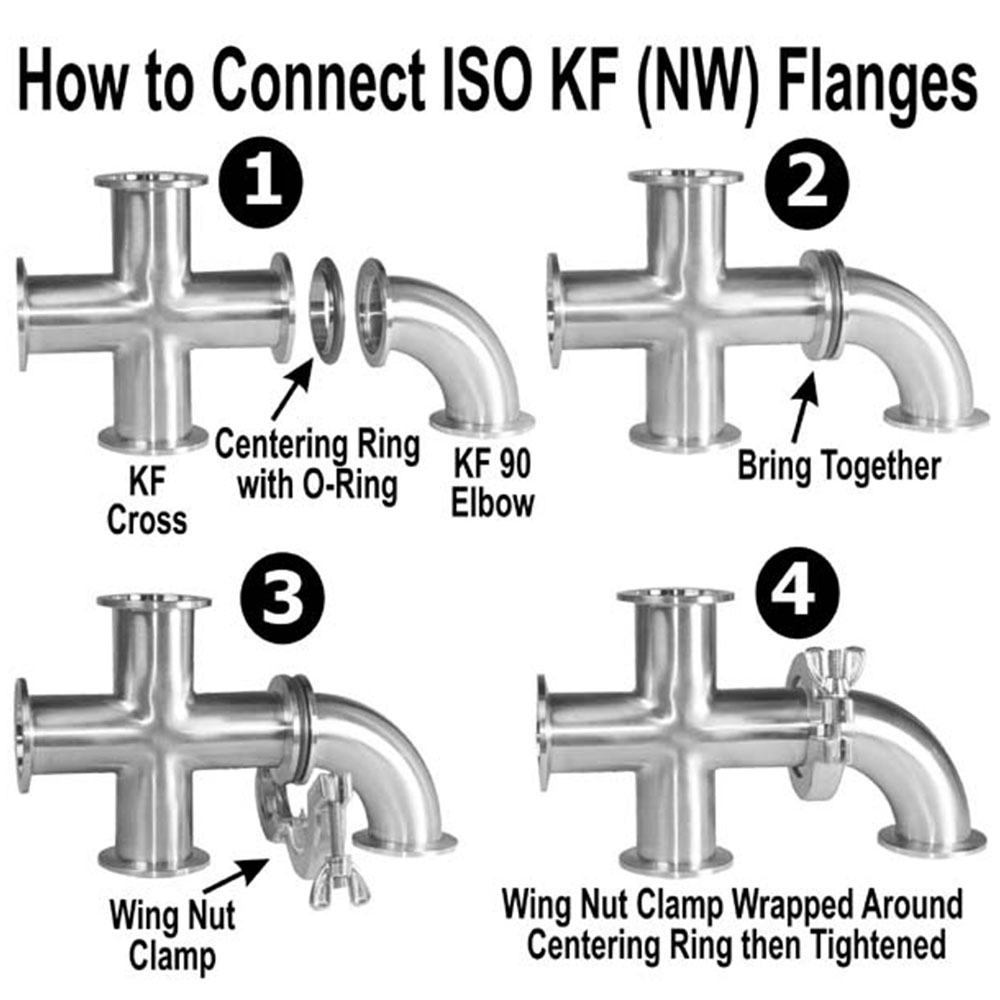 These KF-16 Bellows hose vacuum fittings follow ISO-KF standards and have a flange size of NW-16. They are commonly used to build foreline vacuum plumbing and process systems. They are often called quick flange fittings because they are quick to assemble. A circumferential clamp and centering ring form the vacuum seal between the connecting flanges . The centering ring contains a rubber elastomer o-ring. The standard sizes for quick flange fittings are KF-10, KF-16, KF-25, KF-40, and KF-50 with flange sizes NW-10, NW-16, NW-25, NW-40, and NW-50, respectively. They are made of corrosive resistant stainless steel.