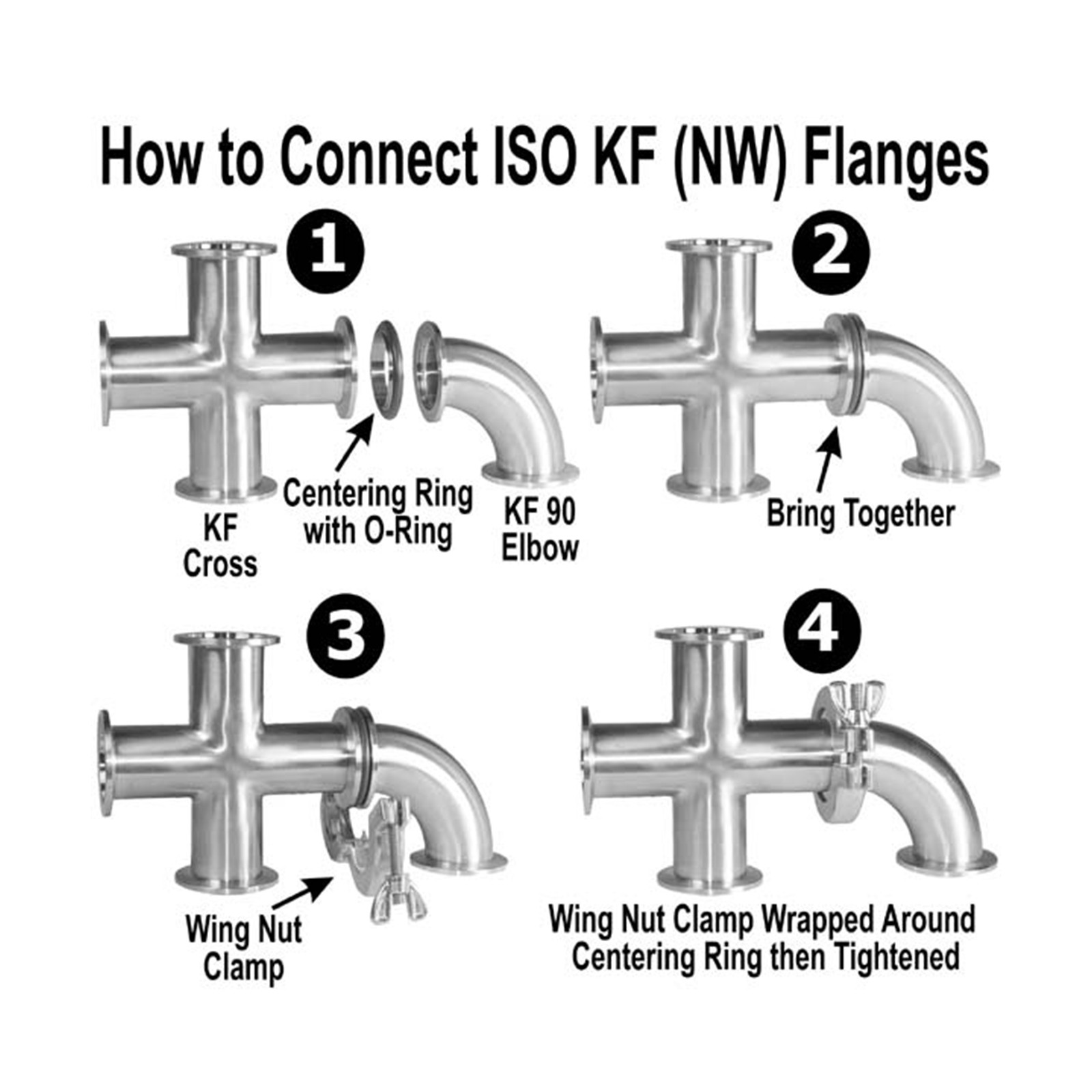 These KF-25 Bellows hose vacuum fittings follow ISO-KF standards and have a flange size of NW-25. They are commonly used to build foreline vacuum plumbing and process systems. They are often called quick flange fittings because they are quick to assemble. A circumferential clamp and centering ring form the vacuum seal between the connecting flanges . The centering ring contains a rubber elastomer o-ring. The standard sizes for quick flange fittings are KF-10, KF-16, KF-25, KF-40, and KF-50 with flange sizes NW-10, NW-16, NW-25, NW-40, and NW-50, respectively. They are made of corrosive resistant stainless steel.