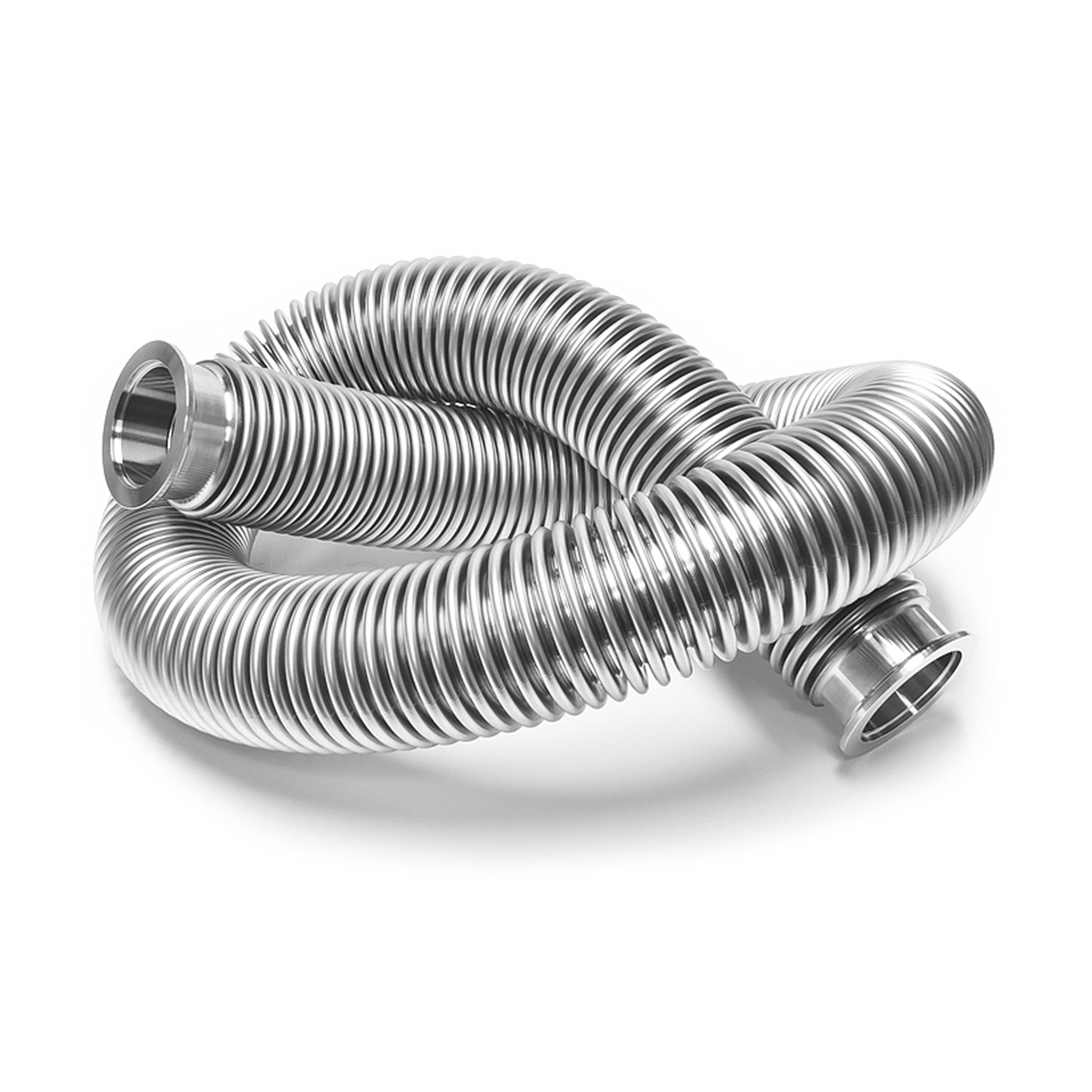 These KF-40 Bellows hose vacuum fittings follow ISO-KF standards and have a flange size of NW-40. They are commonly used to build foreline vacuum plumbing and process systems. They are often called quick flange fittings because they are quick to assemble. A circumferential clamp and centering ring form the vacuum seal between the connecting flanges . The centering ring contains a rubber elastomer o-ring. The standard sizes for quick flange fittings are KF-10, KF-16, KF-25, KF-40, and KF-50 with flange sizes NW-10, NW-16, NW-25, NW-40, and NW-50, respectively. They are made of corrosive resistant stainless steel.